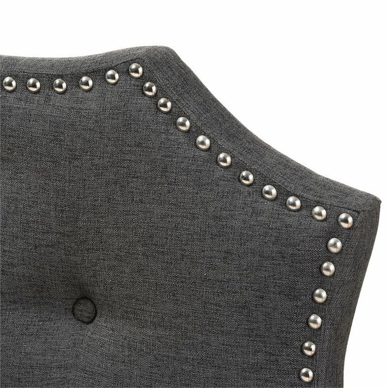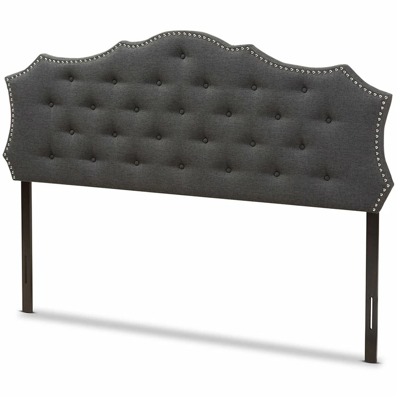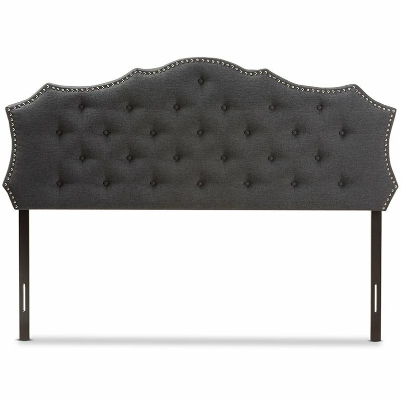 Classic finishes and an elegant curved shape make the Aurora fabric upholstered headboard the perfect centerpiece in your bedroom or guest room. Constructed of solid rubberwood frame, the Aurora headboard is upholstered in dark gray polyester fabric that is durable. Featuring curvaceous style lines with button-tufted design, the Aurora is glamorously trimmed with silver nail heads. The headboard is supported sturdily by solid wood posts and is exceptionally cushioned to provide softness and shape while you sit up.