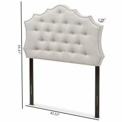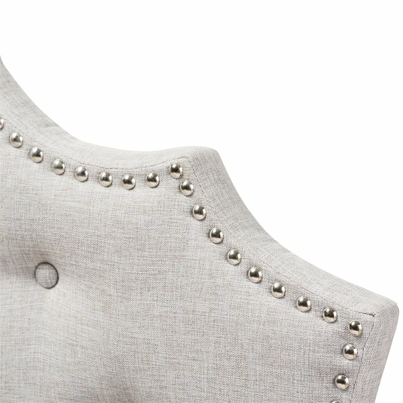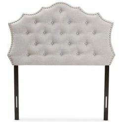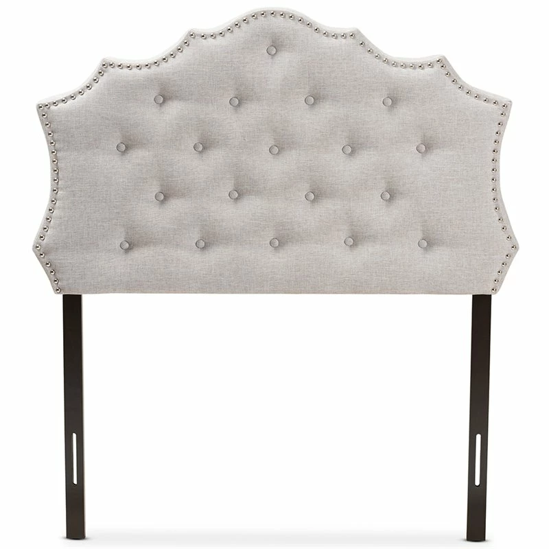 Classic finishes and an elegant curved shape make the Aurora fabric upholstered headboard the perfect centerpiece in your bedroom or guest room. Constructed of solid rubberwood frame, the Aurora headboard is upholstered in grayish beige polyester fabric that is durable. Featuring curvaceous style lines with button-tufted design, the Aurora is glamorously trimmed with silver nail heads. The headboard is supported sturdily by solid wood posts and is exceptionally cushioned to provide softness and shape while you sit up.