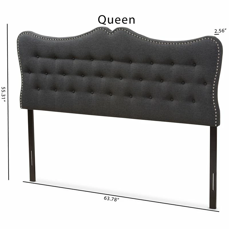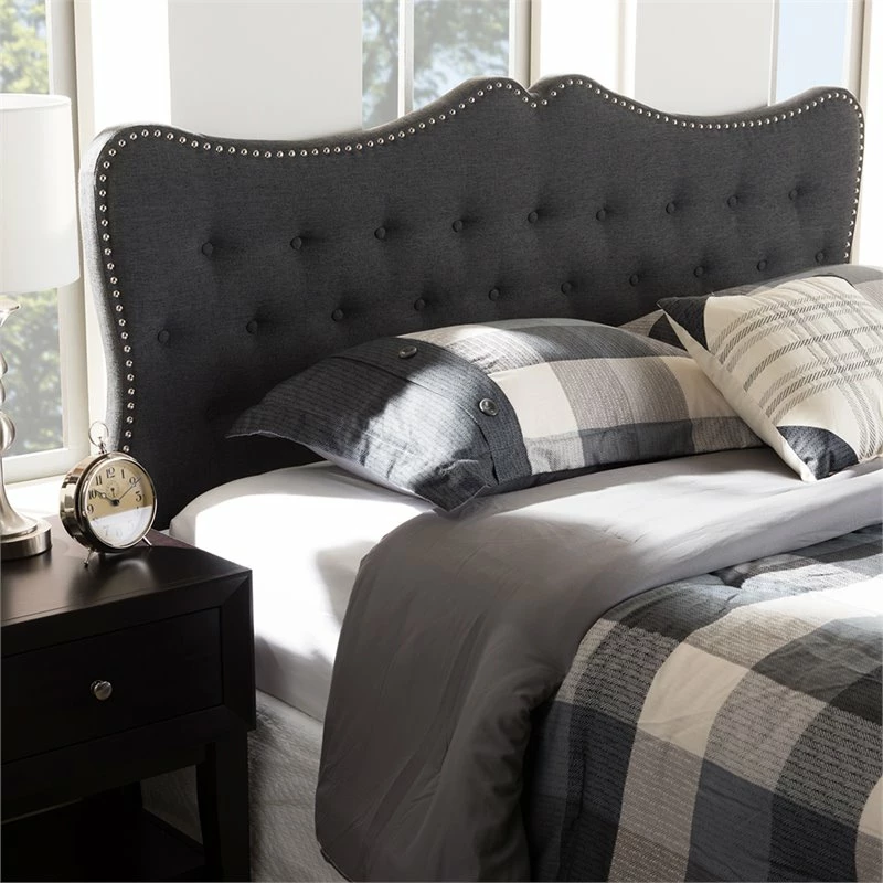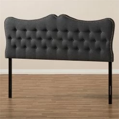 Classic curves, soft fabric, and sparkly metallic studs add a sense of glamour to your bedroom interior with the Emma contemporary headboard. Constructed of solid rubberwood frame, the Emma headboard is upholstered in dark gray polyester fabric that is durable. Featuring a curvaceous outline with button-tufted design for a classic look, the headboard is supported sturdily by solid wood posts and cushioned for added softness and shape, providing a comfortable leaning space while you sit up.