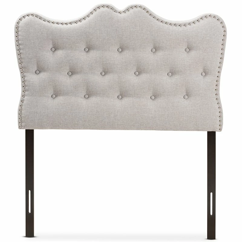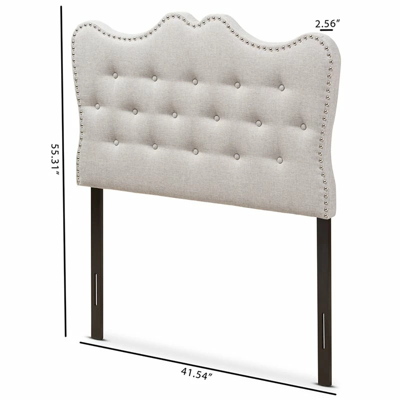 Classic curves, soft fabric, and sparkly metallic studs add a sense of glamour to your bedroom interior with the Emma contemporary headboard. Constructed of solid rubberwood frame, the Emma headboard is upholstered in grayish beige polyester fabric that is durable. Featuring a curvaceous outline with button-tufted design for a classic look, the headboard is supported sturdily by solid wood posts and cushioned for added softness and shape, providing a comfortable leaning space while you sit up.