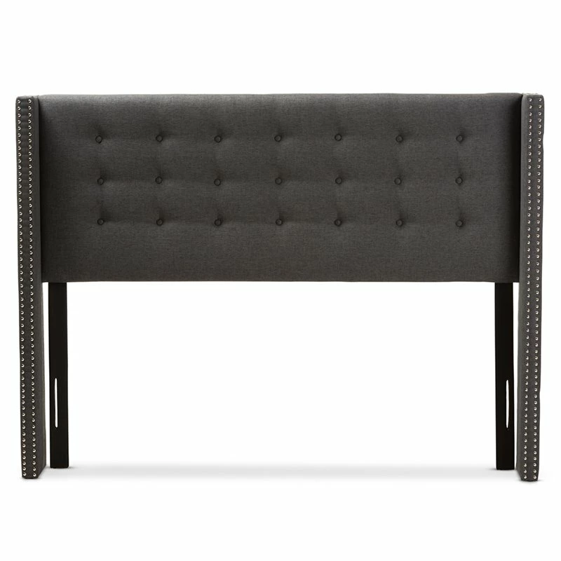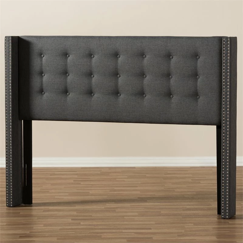 Exhibit luxury looks in your bedroom with the focal point of the lovely Ginaro dark Gray fabric upholstered winged headboard. Constructed of solid rubber wood and plywood for strength and sturdiness, the Ginaro features button-tufted design in diamond shape and winged headboard with silver nail heads trims for luxury look in your bedroom. For extra comfort and an up-to-date look, the Ginaro is upholstered with dark Gray polyester fabric over the padded foam for softness and shape that’s comfortable to lean against. Assembly required, this modern and contemporary full size headboard is made in Malaysia.