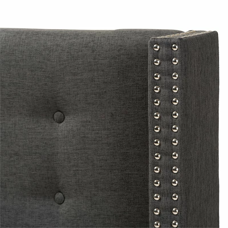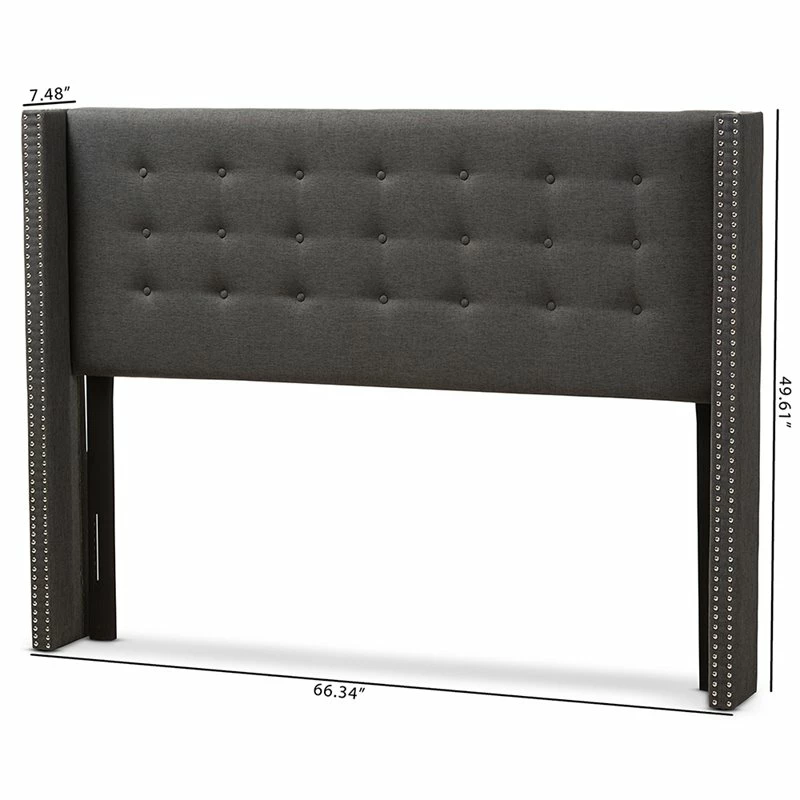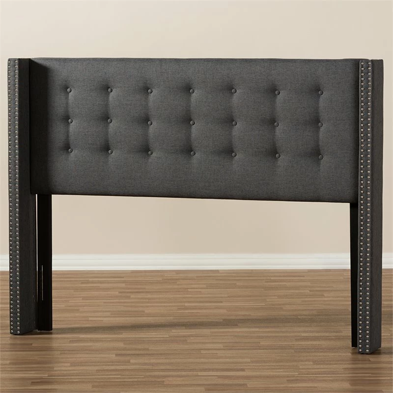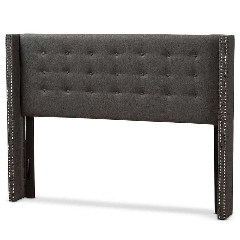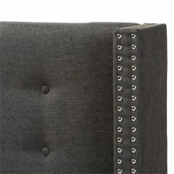 Exhibit luxury looks in your bedroom with the focal point of the lovely Ginaro dark Gray fabric upholstered winged headboard. Constructed of solid rubber wood and plywood for strength and sturdiness, the Ginaro features button-tufted design in diamond shape and winged headboard with silver nail heads trims for luxury look in your bedroom. For extra comfort and an up-to-date look, the Gina is upholstered with dark Gray polyester fabric over the padded foam for softness and shape that’s comfortable to lean against. Assembly required, this modern and contemporary queen size headboard is made in Malaysia.
