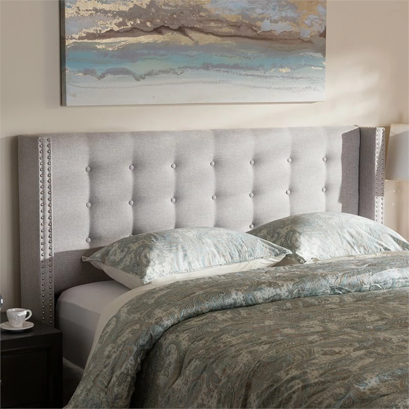 Exhibit luxury looks in your bedroom with the focal point of the lovely Ginaro Grayish beige fabric upholstered winged headboard. Constructed of solid rubber wood and plywood for strength and sturdiness, the Ginaro features button-tufted design in diamond shape and winged headboard with silver nail heads trims for luxury look in your bedroom. For extra comfort and an up-to-date look, the Gina is upholstered with Grayish beige polyester fabric over the padded foam for softness and shape that’s comfortable to lean against. Assembly required, this modern and contemporary queen size headboard is made in Malaysia.