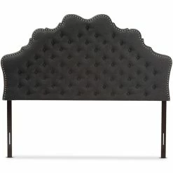 Complete your bedroom interior with the Hilda fabric upholstered headboard. Constructed of solid rubberwood and MDF, the Hilda headboard is upholstered in durable dark gray fabric. Featuring a curvaceous design with silver nail heads trim and button-tufting design for a glamour look, the Hilda offers a touch of modern sophistication. The mounting wood post is made from quality rubberwood for stability and strength. Cushioned headboard provides softness and shape, allowing you to rest comfortably.