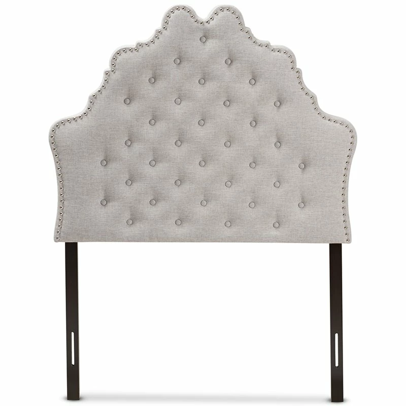 Complete your bedroom interior with the Hilda fabric upholstered headboard. Constructed of solid rubberwood and MDF, the Hilda headboard is upholstered in durable grayish beige fabric. Featuring a curvaceous design with silver nail heads trim and button-tufting design for a glamour look, the Hilda offers a touch of modern sophistication. The mounting wood post is made from quality rubberwood for stability and strength. Cushioned headboard provides softness and shape, allowing you to rest comfortably.