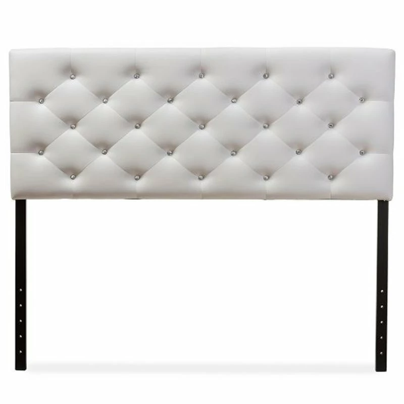 Straight lines and button-back detailing offers your sleep space a plush symmetry with the Viviana Upholstered Headboard. Impart a unique elegance into your bedroom interior with this classic piece of furniture. The Viviana is constructed of quality hardwood frame and is cushioned with high density foam for softness and shape. For an ultra elegant look, the white faux leather headboard is button tufted with faux crystal buttons. The headboard sits between the wall and the ensemble frame, attaching not to the bed base but to the legs, for stability. The leg supports are invisible once set up and can be adjusted to suit the height of your ensemble for convenience. Made in Malaysia, the headboard requires assembly.