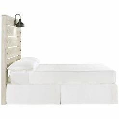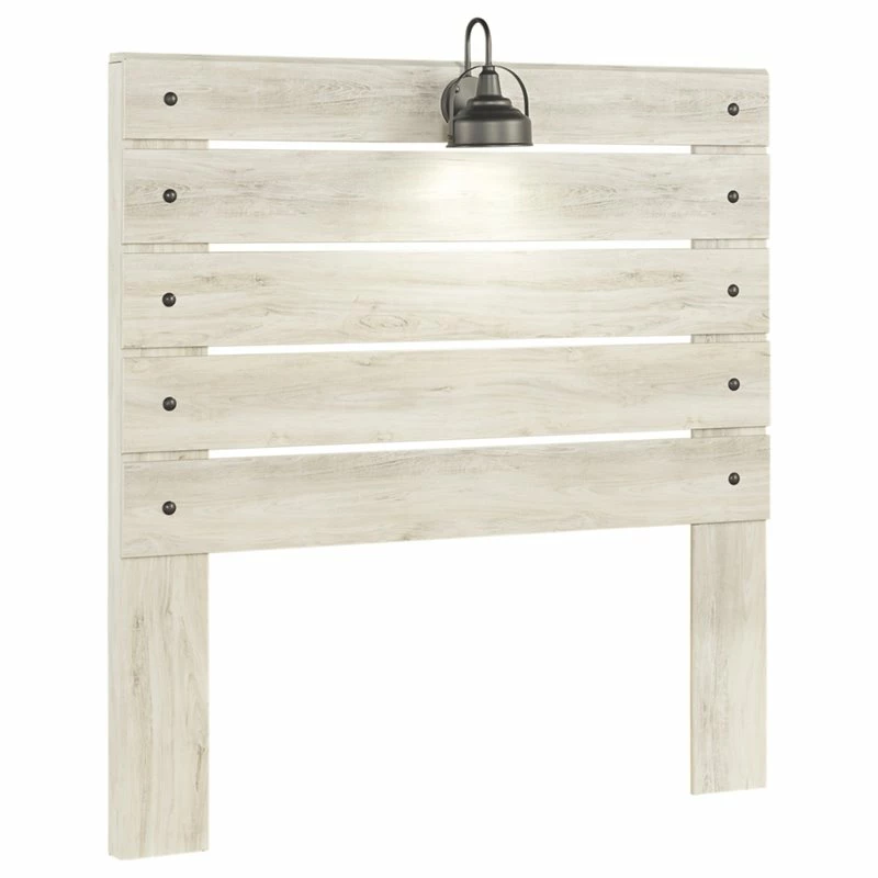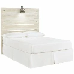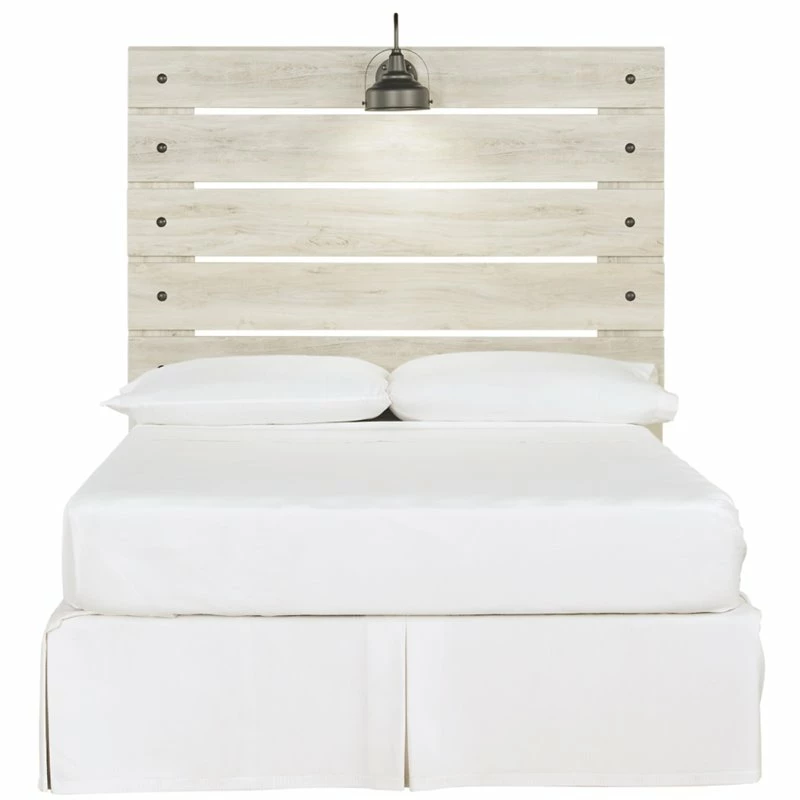 What a delightful take on rustic industrial style. Whether modern loft or modern farmhouse, the Cambeck full panel headboard makes itself at home. The wispy whitewash palette enhances without covering the grain for that weathered look you crave. Love to read in bed? You’re sure to find the retro-chic light sconces and USB plug-ins on the open-slat style headboard such a bright idea.