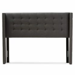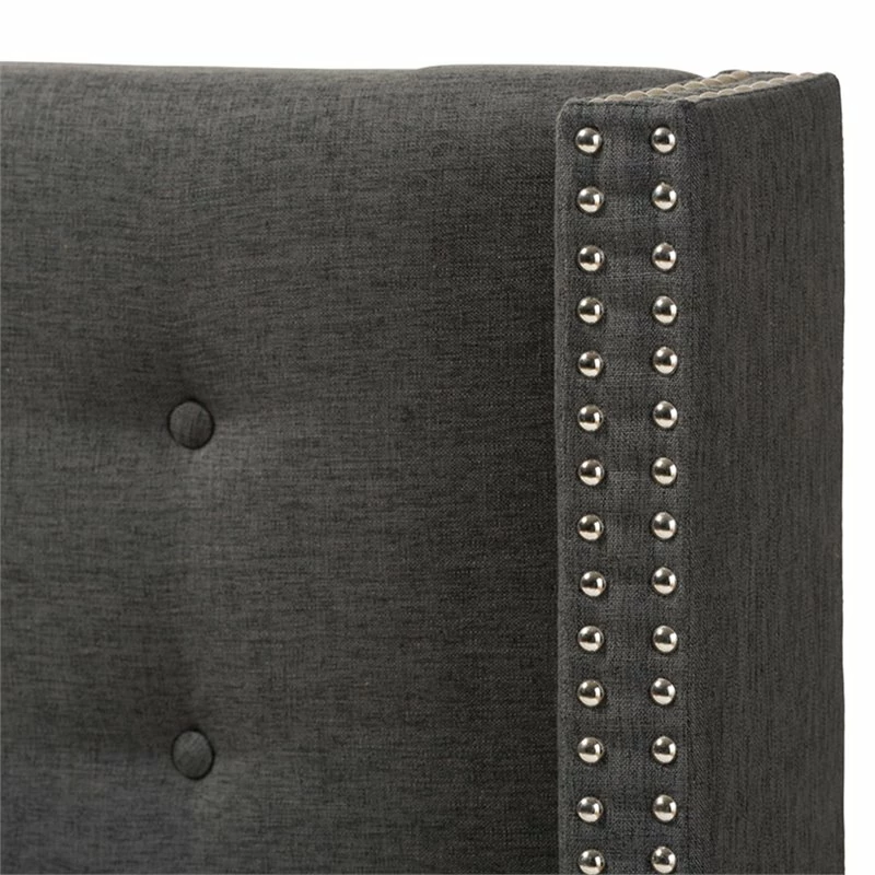 Exhibit luxury looks in your bedroom with the focal point of the lovely dark Gray fabric upholstered winged headboard. Constructed of solid rubber wood and plywood for strength and sturdiness, the headboard features button-tufted design in diamond shape and winged headboard with silver nail heads trims for luxury look in your bedroom. For extra comfort and an up-to-date look, the headboard is upholstered with dark Gray polyester fabric over the padded foam for softness and shape that’s comfortable to lean against. Assembly required, this modern and contemporary full size headboard is made in Malaysia.