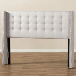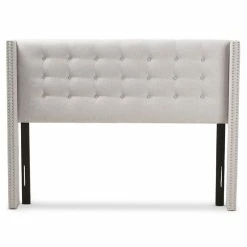 Exhibit luxury looks in your bedroom with the focal point of the lovely Grayish beige fabric upholstered winged headboard. Constructed of solid rubber wood and plywood for strength and sturdiness, the headboard features button-tufted design in diamond shape and winged headboard with silver nail heads trims for luxury look in your bedroom. For extra comfort and an up-to-date look, the headboard is upholstered with Grayish beige polyester fabric over the padded foam for softness and shape that’s comfortable to lean against. Assembly required, this modern and contemporary queen size headboard is made in Malaysia.