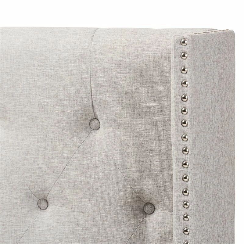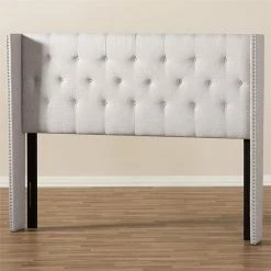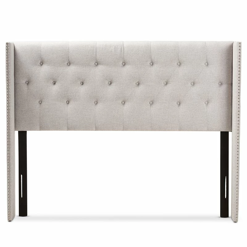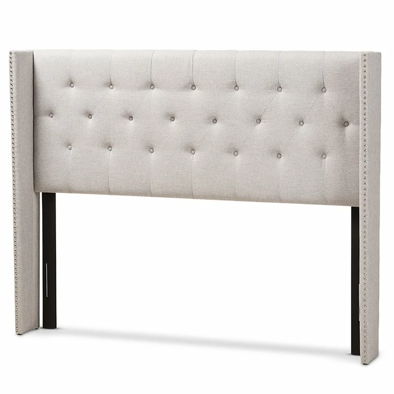 Complete the look of your sleep space with a touch of classic yet modern, textured style with this Grayish beige fabric upholstered winged headboard. Constructed of solid rubber wood and plywood frame for long-lasting strength and structural support, the headboard is upholstered with polyester fabric that’s durable and soft to touch. Foam filling offers a soft finish for plush and comfortable style. The headboard features a rectangular-angled frame in standard king size with button-tufted detail finish, and curved wings that follow down to base for stability. For glamour and an updated look, the silver nail heads trim along the sides of the winged headboard. Frame your sleep space with this up-to-date classic, upholstered style without renewing your existing bed set-up. Made in Malaysia, the headboard imparts a sense of refined elegance into your bedroom interior.