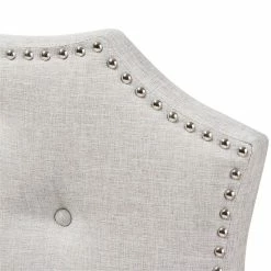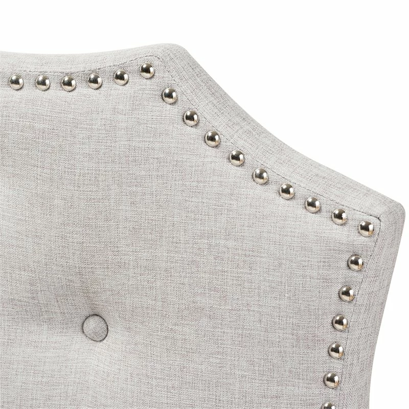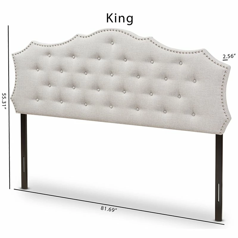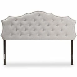 Classic finishes and an elegant curved shape make the Bowery Hill fabric upholstered headboard the perfect centerpiece in your bedroom or guest room. Constructed of solid rubberwood frame, the headboard is upholstered in grayish beige polyester fabric that is durable. Featuring curvaceous style lines with button-tufted design, the headboard is glamorously trimmed with silver nail heads. The headboard is supported sturdily by solid wood posts and is exceptionally cushioned to provide softness and shape while you sit up.