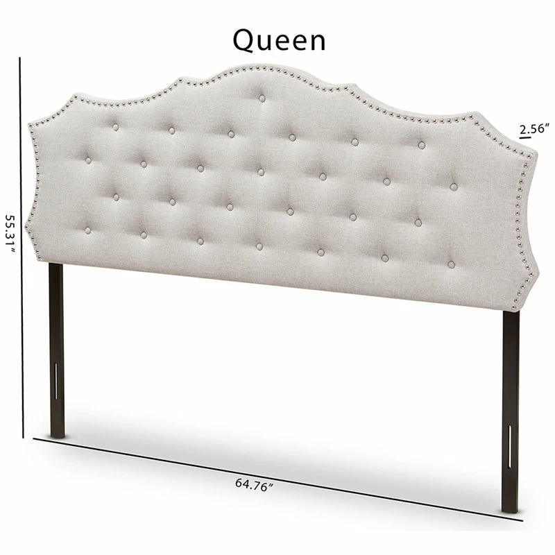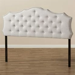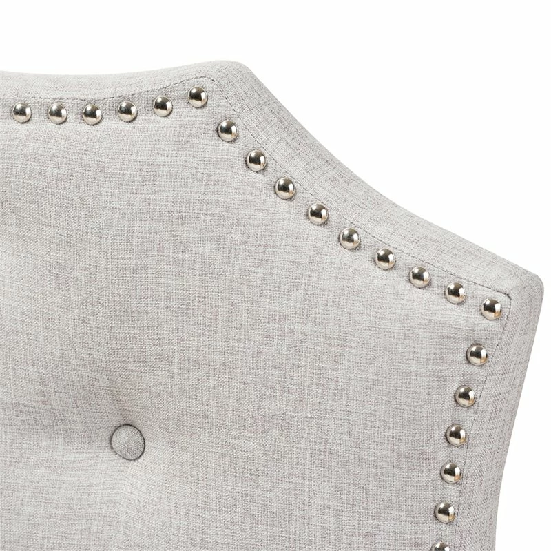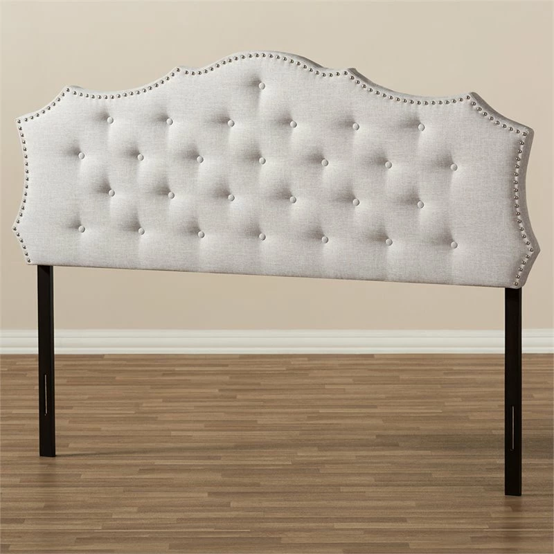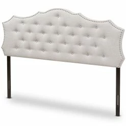 Classic finishes and an elegant curved shape make the Bowery Hill fabric upholstered headboard the perfect centerpiece in your bedroom or guest room. Constructed of solid rubberwood frame, the headboard is upholstered in grayish beige polyester fabric that is durable. Featuring curvaceous style lines with button-tufted design, the headboard is glamorously trimmed with silver nail heads. The headboard is supported sturdily by solid wood posts and is exceptionally cushioned to provide softness and shape while you sit up.