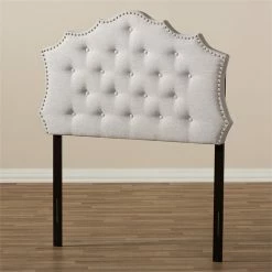 Classic finishes and an elegant curved shape make the Bowery Hill fabric upholstered headboard the perfect centerpiece in your bedroom or guest room. Constructed of solid rubberwood frame, the headboard is upholstered in grayish beige polyester fabric that is durable. Featuring curvaceous style lines with button-tufted design, the headboard is glamorously trimmed with silver nail heads. The headboard is supported sturdily by solid wood posts and is exceptionally cushioned to provide softness and shape while you sit up.