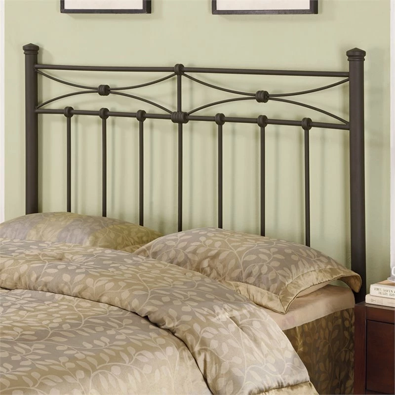 This metal headboard will give your bed a transitional feel. Clean lines combine with curved ones at the top with knob attachments that evoke rustic charm. Posts are topped by simple crown fixtures. The straight metal construction is durable and wrapped in bronze. Headboard fits either full or queen frame and bed sizes.