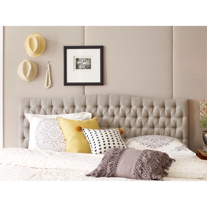 Does your master suite need a facelift? The Elle Decor tufted headboard anchors your bedroom in royal style. As soon as you enter the space, you feel uplifted by the beauty and grace of the headboard. Take another look at the headboard. Do you smile when looking at the attractiveness of the piece? Button-tufted tailoring is pure artistry and the subtle top curve makes a bold complement to the straight edges and wide board. The finely crafted linen upholstery comes in three warm tones, gray, beige and brown. Easily fitted to a queen or king sized bed, the headboard is ready to assemble in ten minutes. With a hardwood frame, this piece is sturdy and long-lasting. You can sit back and read a book or your iPhone with comfortable support before going to bed or upon waking in the morning. It’s both functional and full of contemporary flair. Style comes easily with the Elle Decor headboard. Assembly only takes ten minutes.