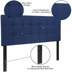 If you like reading or using your tablet or laptop in bed, you need a headboard to provide extra support. A headboard gives your room a very personal touch and allows you to show off your style. This gorgeous navy full headboard features button tufting and a diamond stitch pattern design, fabric upholstery, and includes adjustable metal bed rail slots. The slim panel will make your room feel more spacious. Having just a headboard will provide you with floor space and makes it easy to make up the bed. Whether you’re updating your master bedroom, guest room or furnishing your first apartment or home, this headboard will give a fresh, on-trend look to your space.