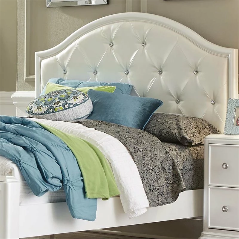 Features an upholstered arched panel tufted with crystal buttons in a iridescent white vinyl. Headboard can stand alone with Hollywood frame. Pair with the footboard and rails for a complete bed.