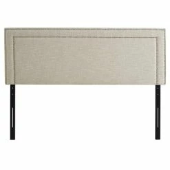Adorn your bed of choice with the elegantly designed Jessamine headboard in fabric. Designed with two rows of silver-accented nail button trim, Jessamine comes finely upholstered in polyester, has a solid wood frame, adjustable wood legs, and dense foam padding for ultimate support. Rejoice with a contemporary design that admirably complements your bedroom décor. Fully compatible with Loryn and Tessie platform bed frames.