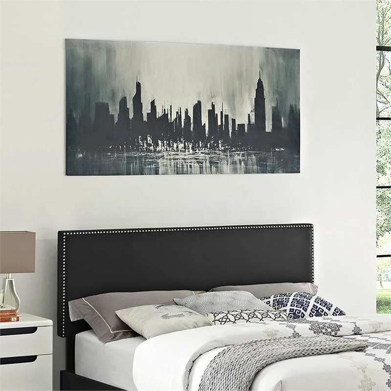Enhance your bedroom with the elegantly designed Phoebe Headboard in Vinyl. Minimalist and chic, Phoebe transforms with sleek lines and a stunning nail button trim accented in silver. Phoebe features a solid wood frame, adjustable black coated metal legs, fine vinyl upholstery, and dense foam padding for ultimate support. Fully Compatible with Sharon, Sherry and Helen Platform Bed Frames. Set Includes: One – Phoebe King Headboard