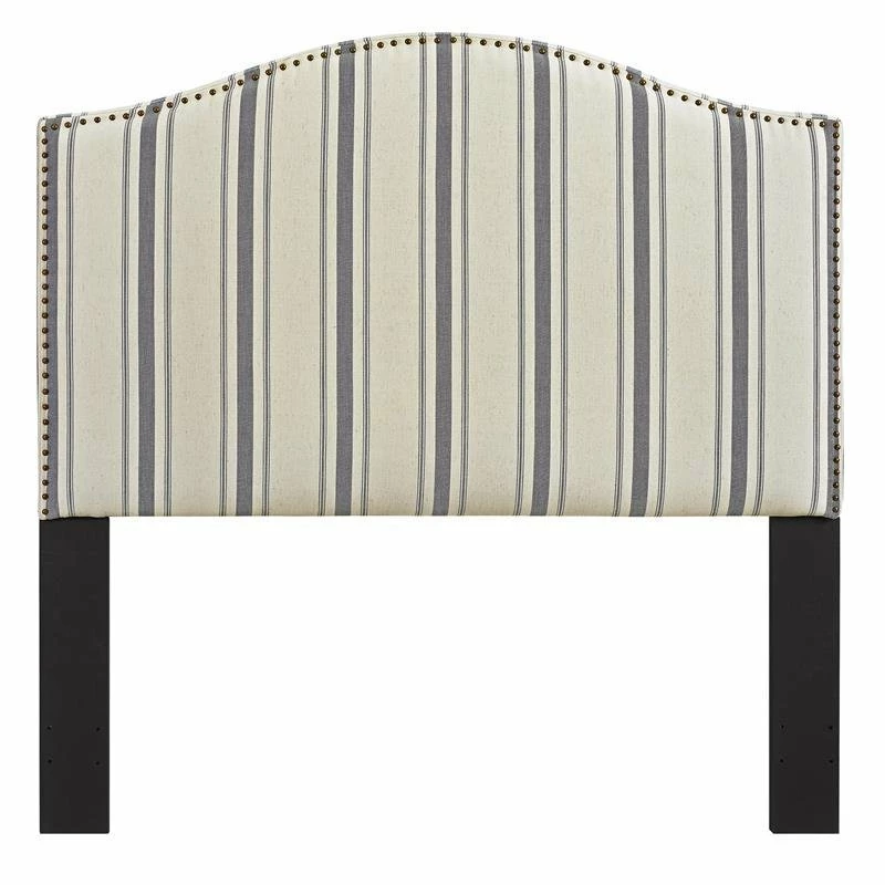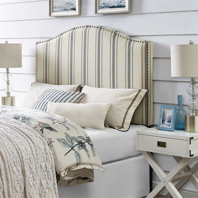 Breezy seaside style invites you to sleep in when you add this charming decor piece to your bedroom. Crisp denim-blue striping trails vertically across an oatmeal background, accentuating the gentle top slope of the silhouette. Along the edges of the linen blend fabric, nailhead trim grounds the color palette, evoking a nostalgic finishing touch. A design that’s sure to help you drift off to dreamland, this appealing upholstered headboard is fresh, fun, and perfect for your bedroom.