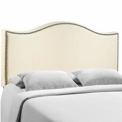 Wavy lines and a welcoming design make the headboard series a selection of elegance. Upholstered in fine linen with a fashionable nail button trim, it shows off the best of modern design with a fluid style that speaks volumes. Made from particleboard with solid wood poles, this makes it easy to curl up to while pleasantly supported by this perfect centerpiece for your bedroom.