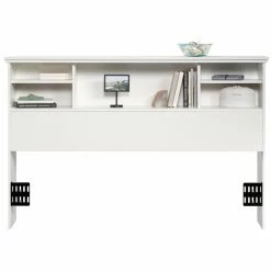 Make a statement in any room with this full/queen headboard from the River Ranch™ collection. This queen bookcase headboard attaches to a full or queen size bed frame, allowing you to upgrade the master bedroom, spare room, or just about anywhere you need a place to lay your head. A spacious display area for your alarm clock, phone, tablet, or books, ensures that this headboard is a functional as it is stylish. Two adjustable shelves allow you to customize and style your new white bookcase headboard to your specific storage and display needs. Easily charge your phone while sleeping because this queen headboard with storage accommodates optional Hidden Wireless Qi Compatible Charger by Eggtronics 425905 (sold separately – visit sauder.com for more information). Your full-size headboard with storage will remain free of tangled cords with the enclosed back panel that features cord access to charge your phone or smart watch. Finished in a Soft White®, this full size bookcase headboard adds simple, clean style with amazing storage potential.